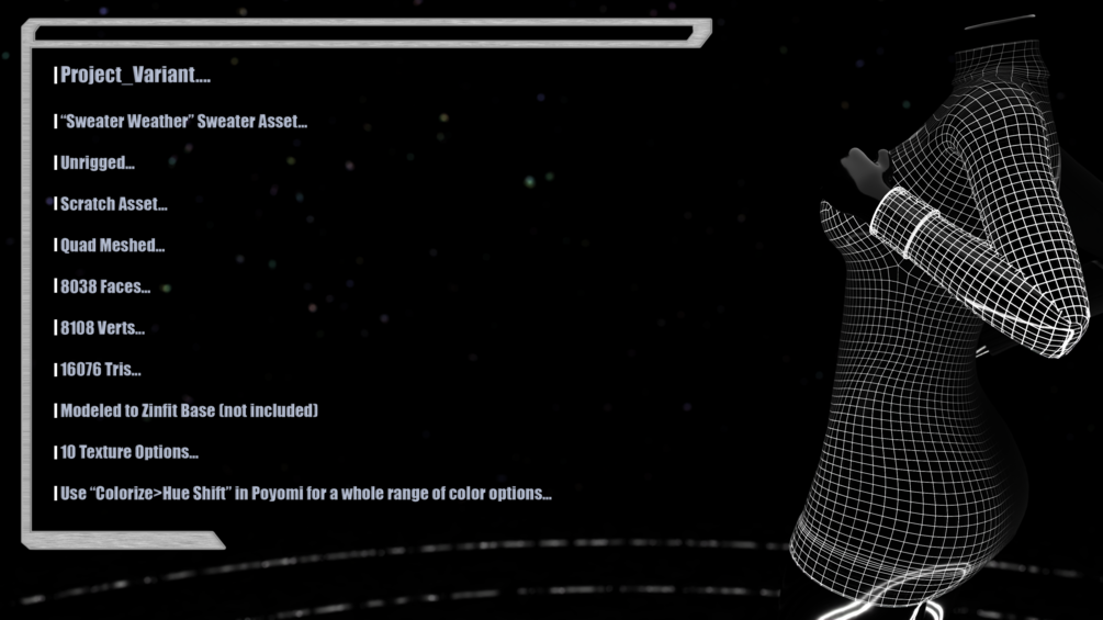 Sweater with 3 texture styles and 5 individual texture schemes. Black and white versions of each for 10 total texture sets.